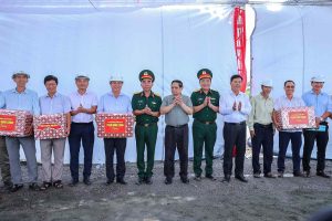 Thủ tướng Phạm Minh Chính tặng quà cho nhà thầu thi công. Thủ tướng đặc biệt nhấn mạnh vai trò tiên phong, xung kích của lực lượng quân đội, công an, khẳng định nhiệm vụ nào cũng hoàn thành, khó khăn nào cũng vượt qua.